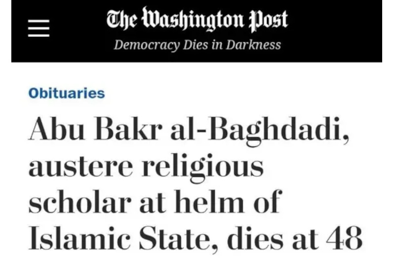 Acest gen de abordare editorială nu este însă nicidecum surprinzătoare. Iată cum prezenta în octombrie 2019 Washington Post moartea liderului organizației islamice ISIS, Abu Bakr al-Baghdadi, unul dintre cei mai căutați lideri teroriști din lume, în timpul unui raid al forțelor speciale americane în nord-vestul Siriei.