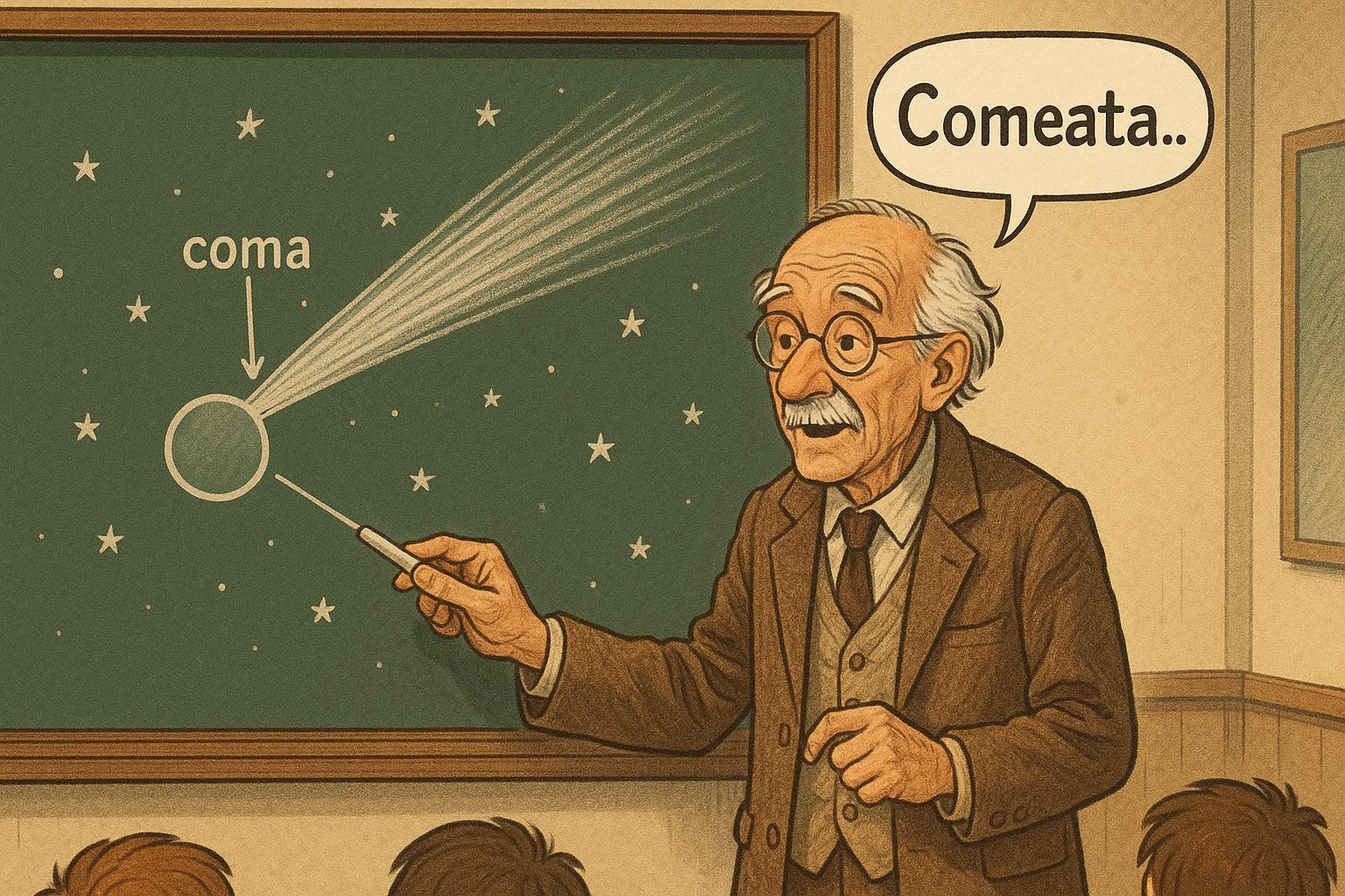 Noi, românii, nu ne-am dezmințit și am făcut ce știm noi mai bine: miștouri. Caragiale a pus în gura vestitului său Mariu Chicoș Rostogan următoarele cuvinte: „Nu fă larmă, spurcăciune!... Silențium și atențiune, că-z intrăm în makerie! Numele „comeată” iaște ghe jănul femenin: o comeată, două comeake, și gherivă ghe la coma, coamă, capelură, pleate lunji, reșpective: comată, comeată, astru pletos, vulgo stea cu coadă. Apărițiunea comeakelor au esărțitat togheauna înrâurire asupra maselor populare, asupra prostimii, cu atâta mai mult că aceea apărițiune au fost prețesă ghe bolizi, mecheori, așteroizi, cari se arată ca o ploaie ghe steale și cari...”